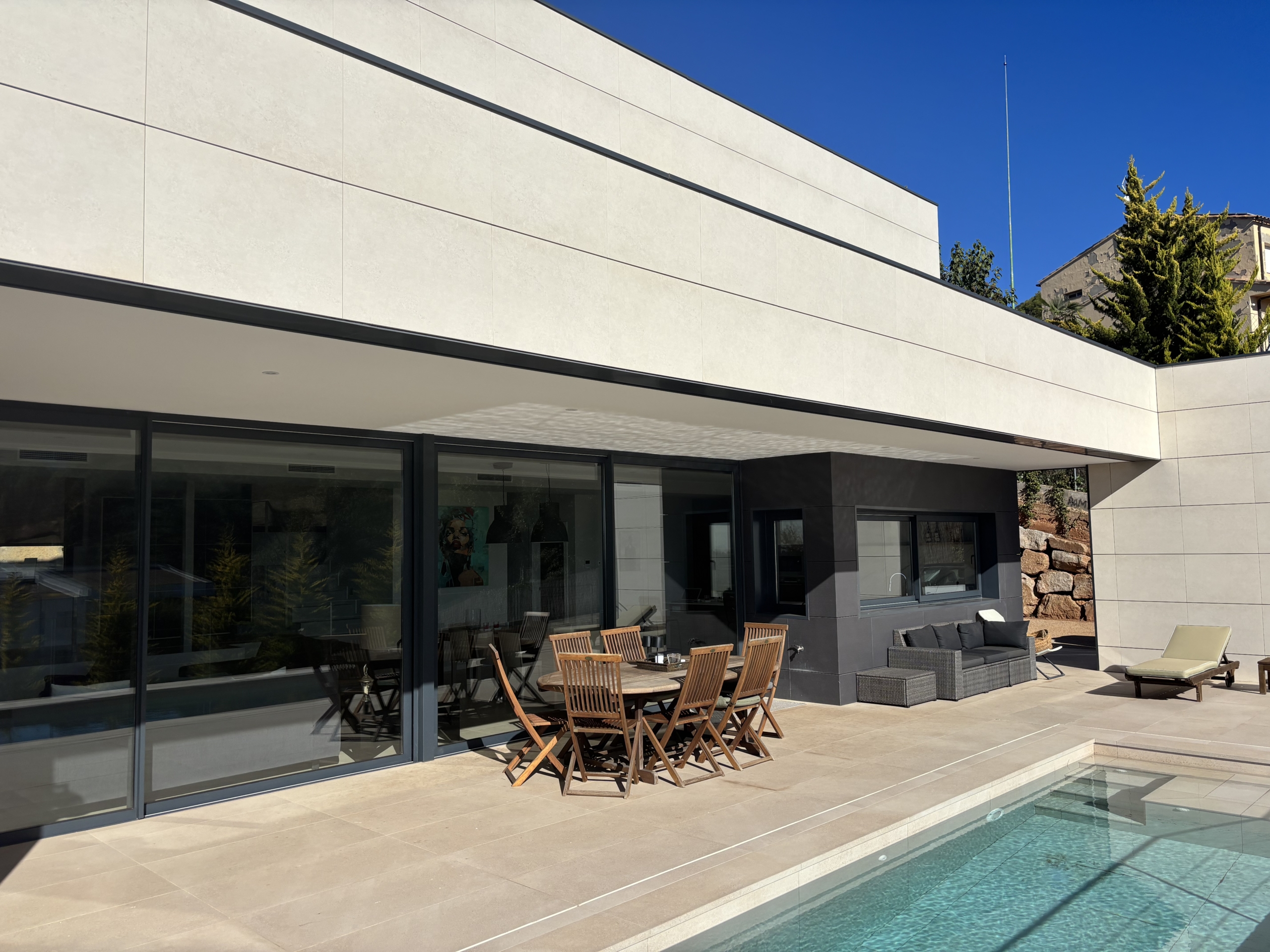 En el exterior, hay una amplia terraza con zona chill-out, piscina privada y un jardín
